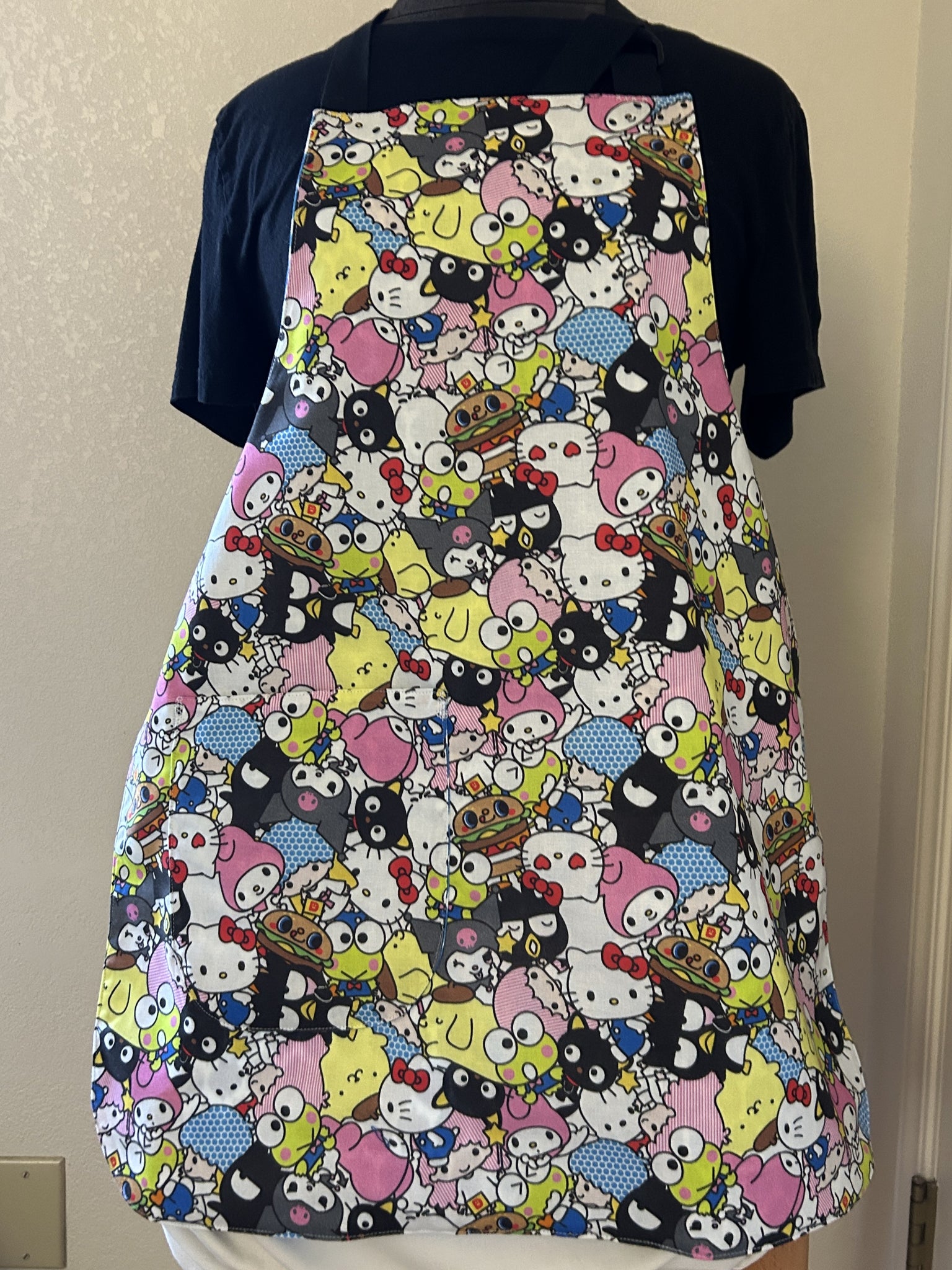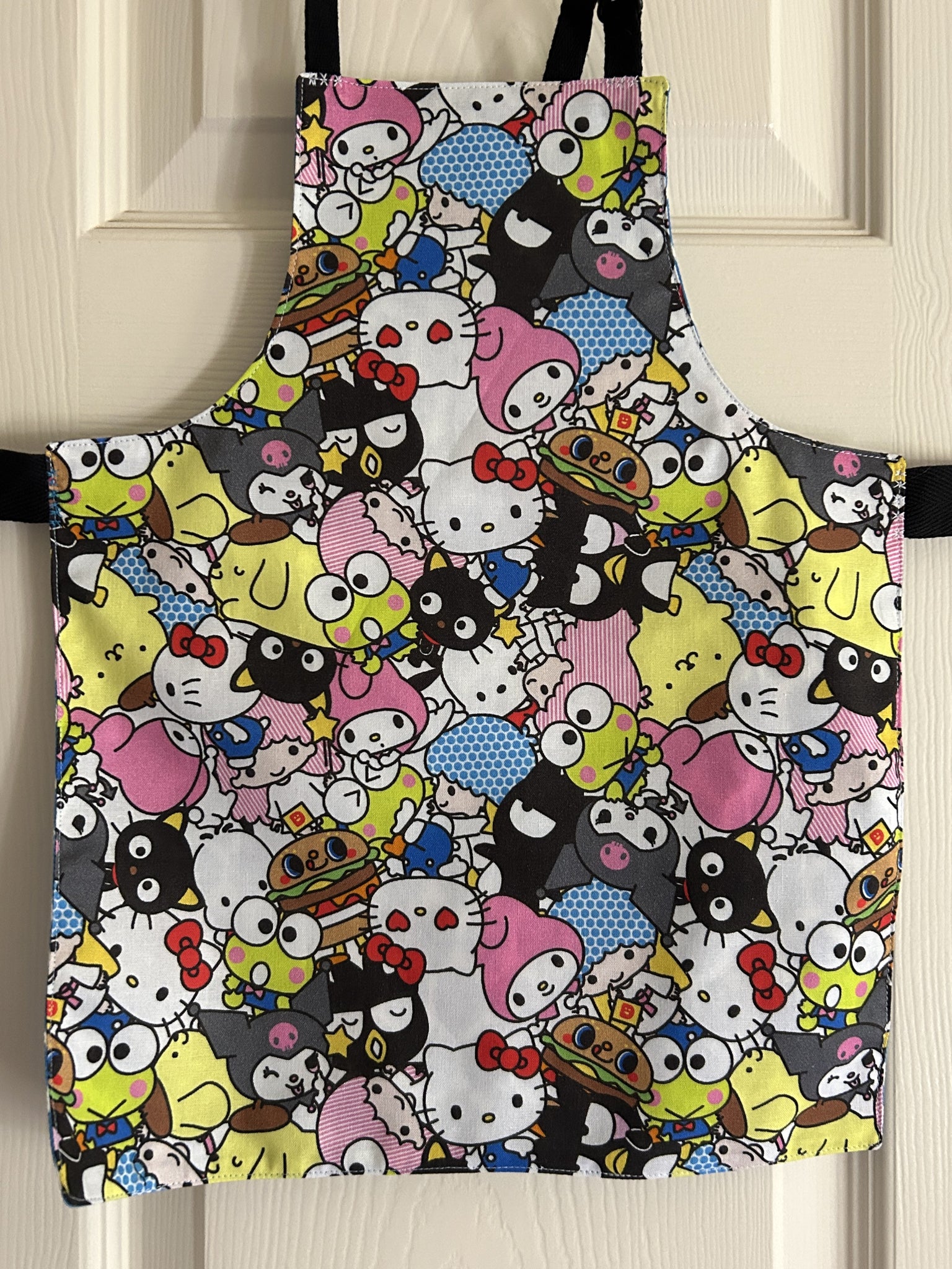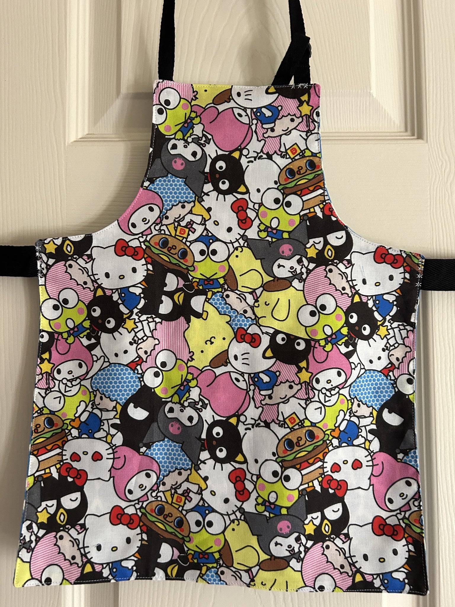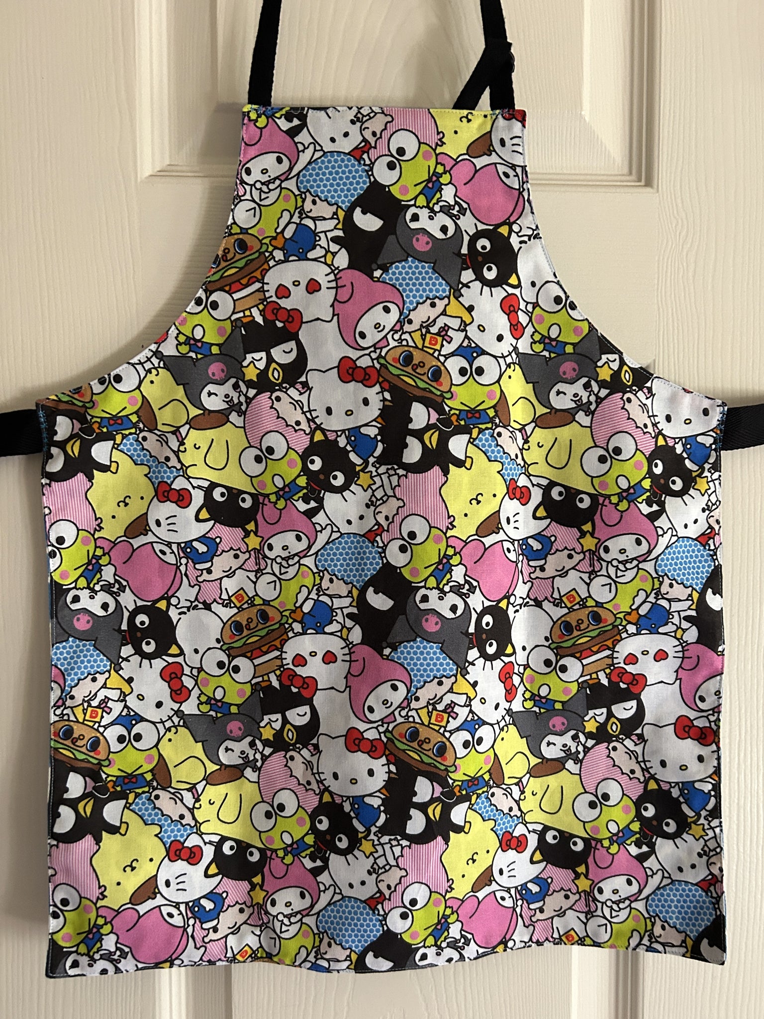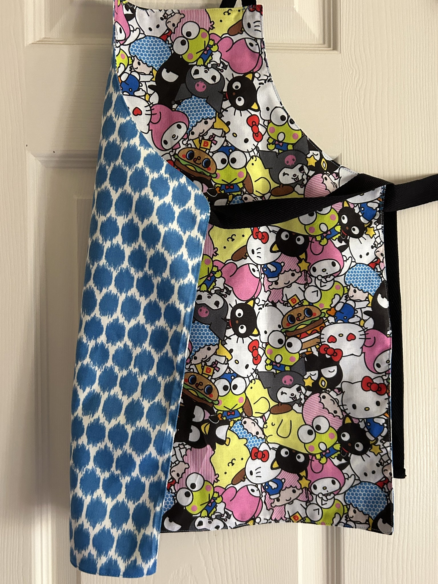 #1 Hello Kitty – Adult Slim Apron. “Rad Kitty” has Hello Kitty on a skateboard and words “Hello Kitty”, “Life is a lot like skateboarding”, “C’mon let’s go out and play!”, and maybe “Sugar for friends” on light pink background; lined with Dayo Fusion Slub, which is a pink and black Leopard print on white background. [9717 & 9718] [sold]