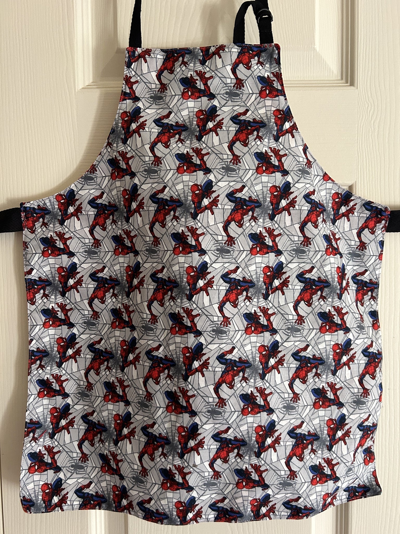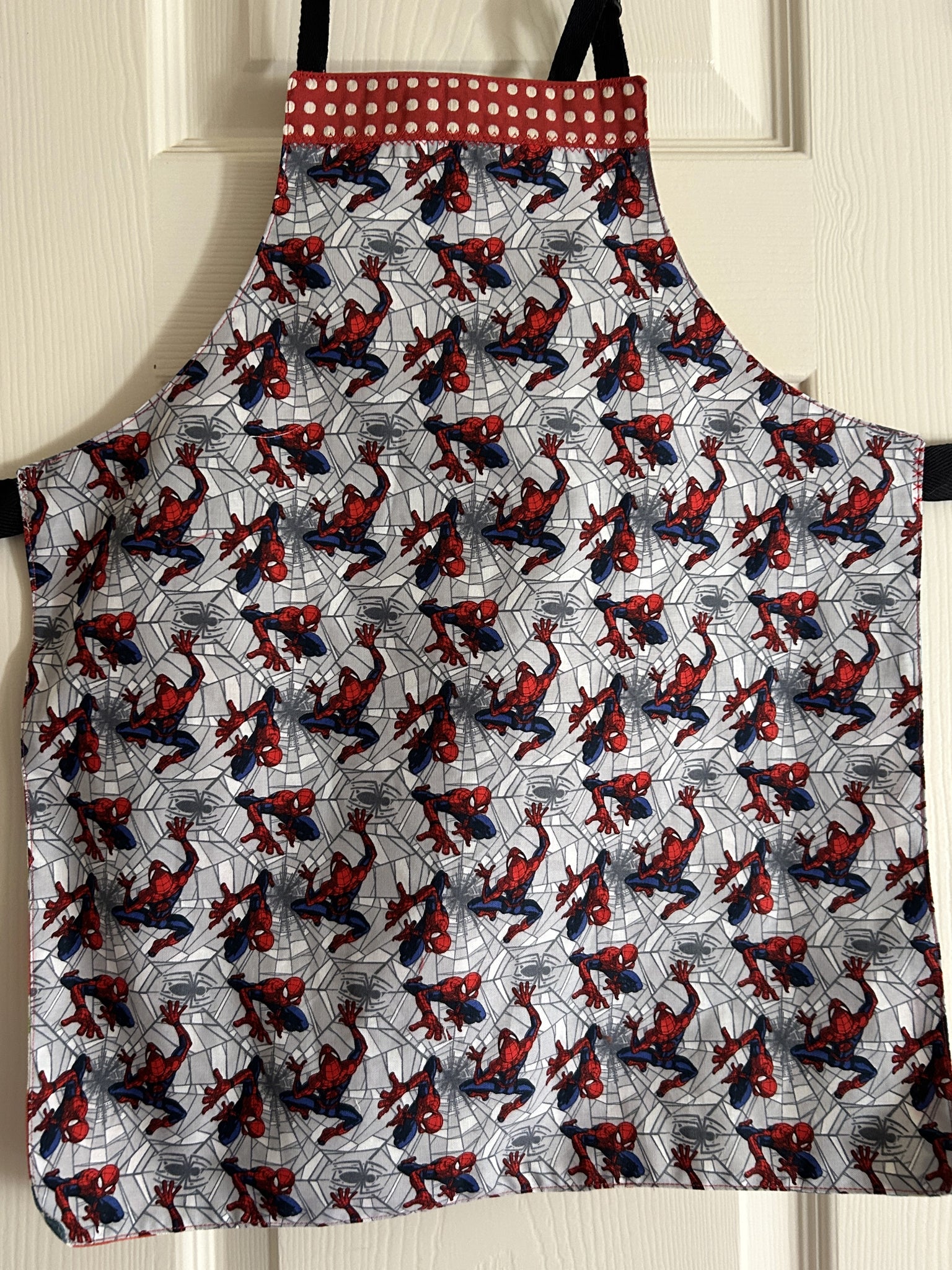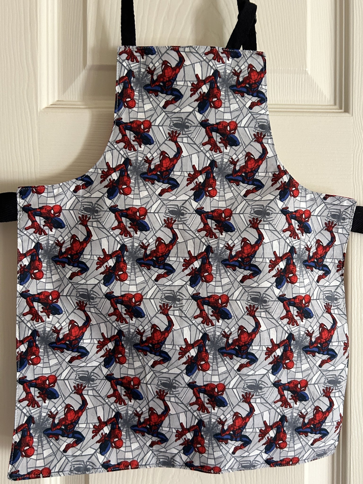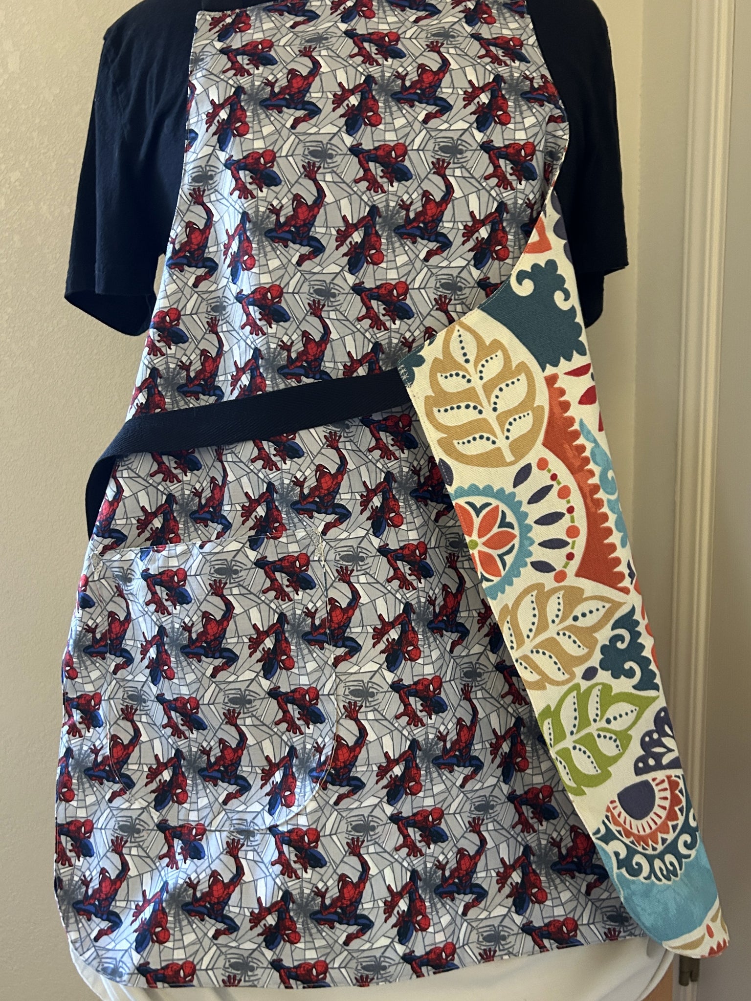#6 Spider-Man Web Crawler. Spider-Man in red and blue crawling over grey and white spider webs, with a 3D effect; lined with Copeland Multi, which is an Indian-inspired print that includes turquoise Elephants, tan Camels, red Chickens, orange Butterflies, tan leaves, chartreuse leaves, and more on white background.
