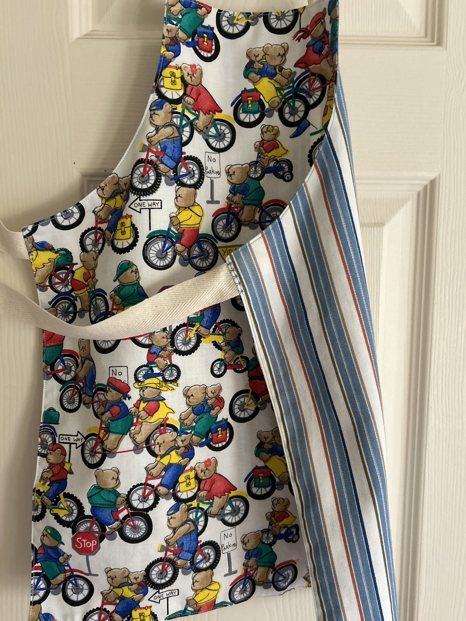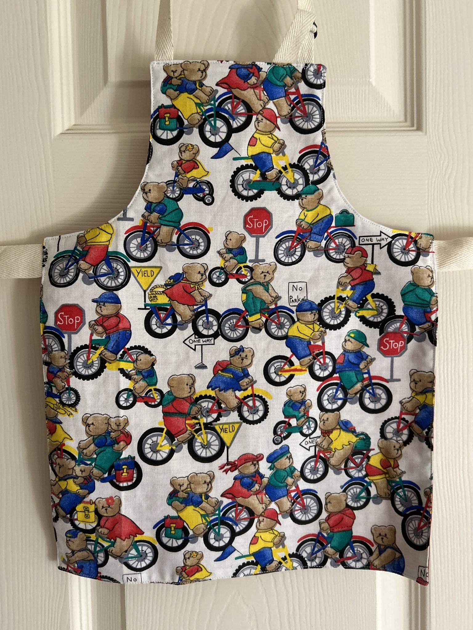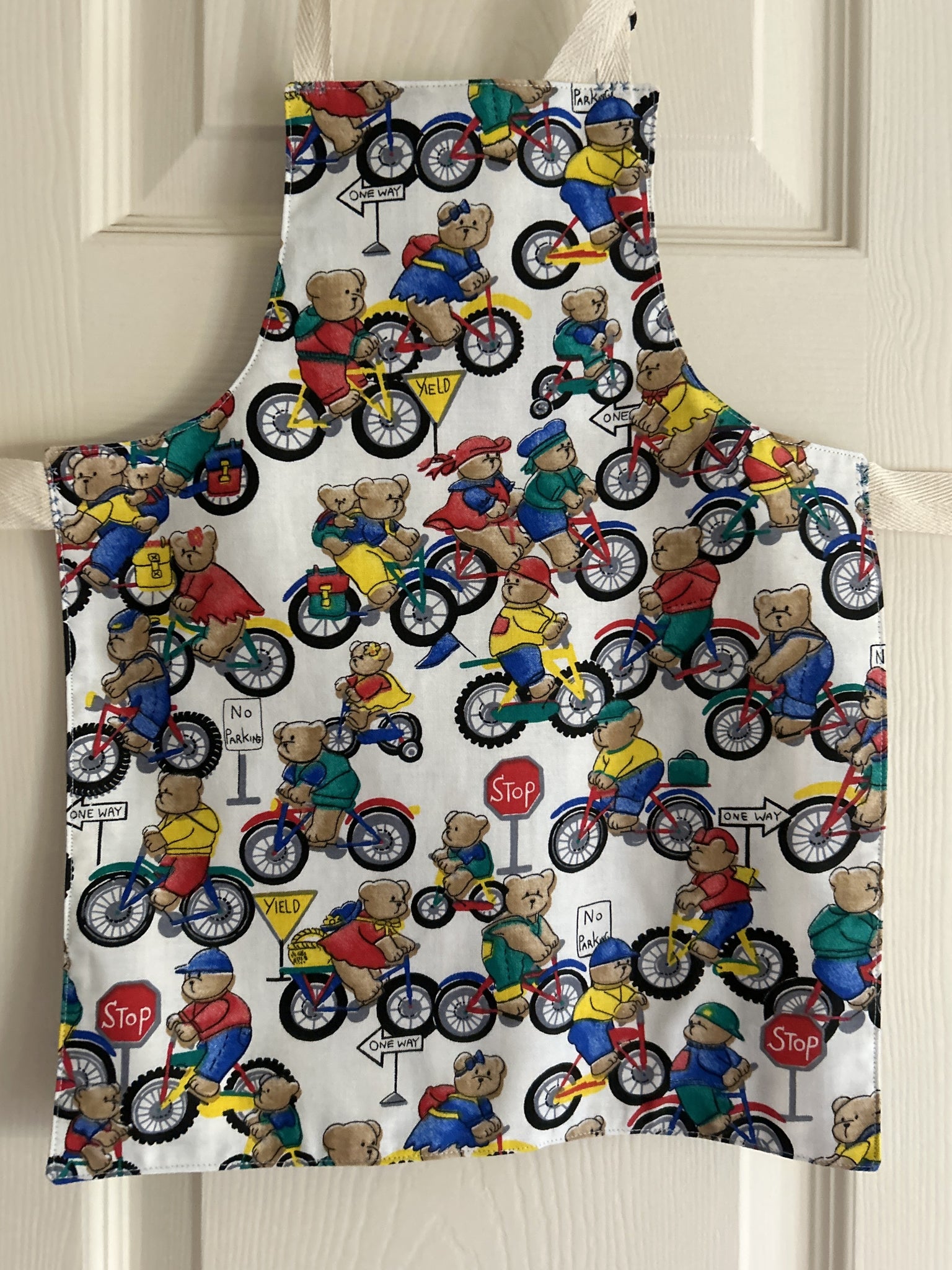 #1 Teddy Bears Riding Bicycles.  This print has boy and girl teddy bears riding bicycles among traffic signs saying “stop”, “yield”, No Parking”, and “One Way”; and wearing clothes in red, blue, green, and yellow; on white background.  They remind me of Paddington Bear (but I’m not British, so others will likely disagree).