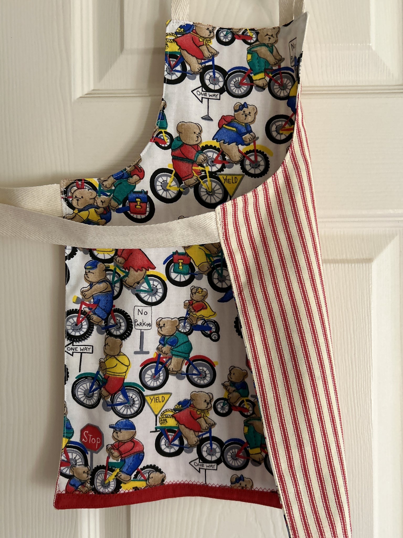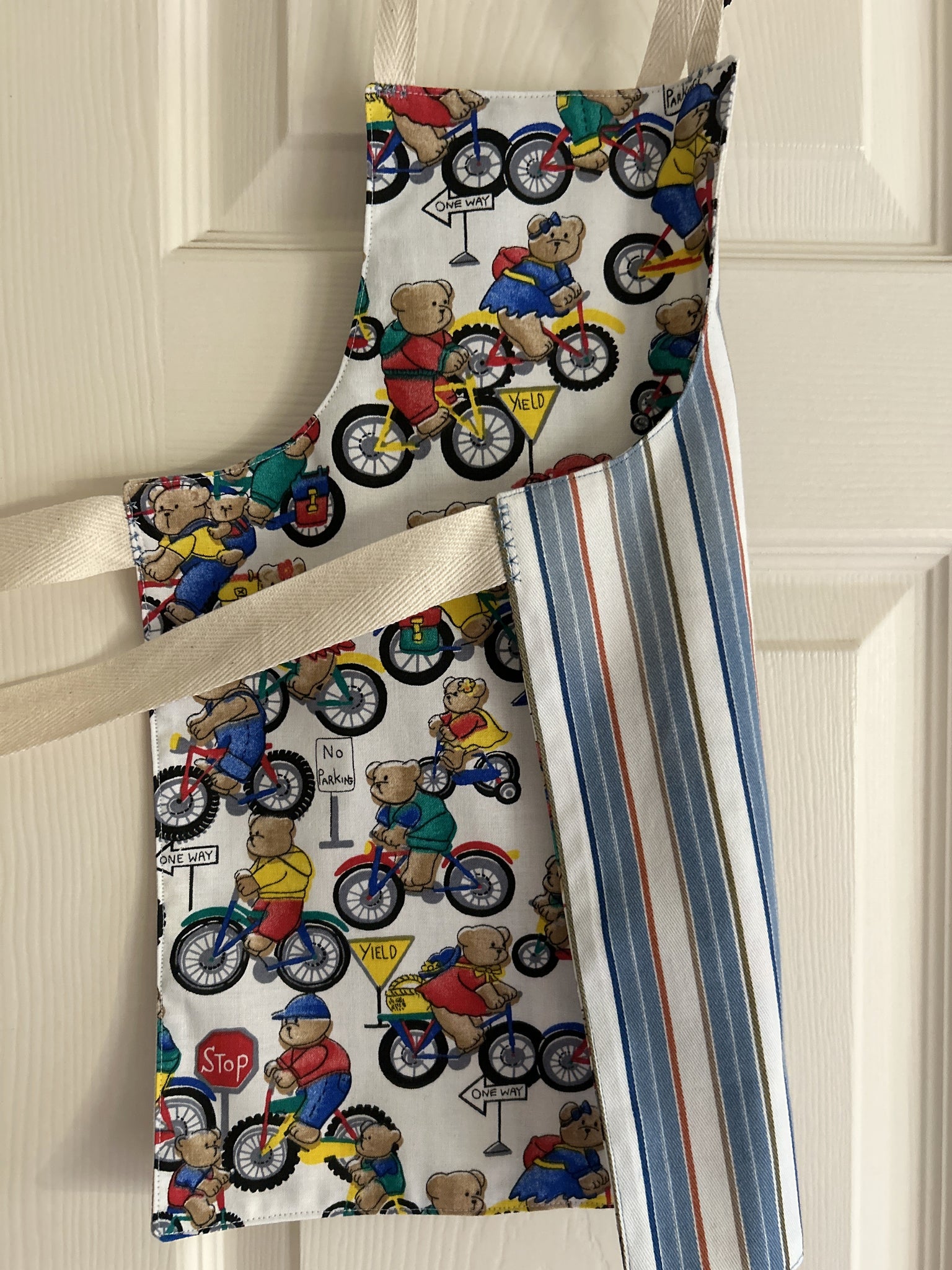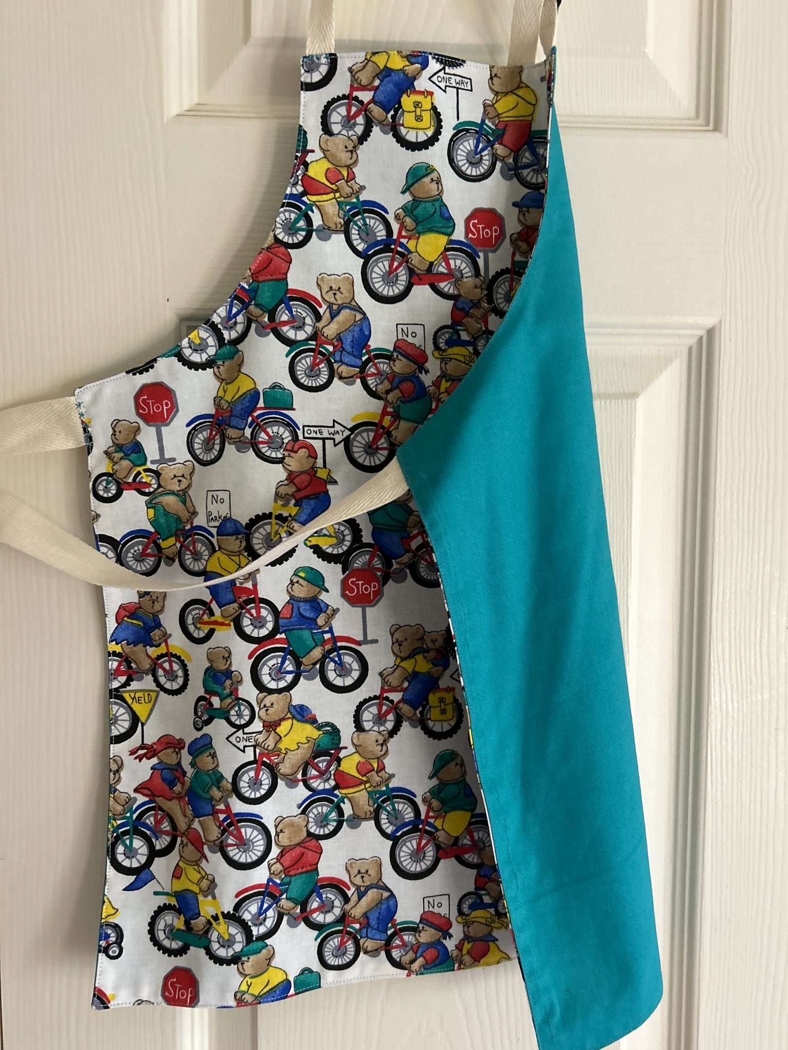 #1 Teddy Bears Riding Bicycles.  This print has boy and girl teddy bears riding bicycles among traffic signs saying “stop”, “yield”, No Parking”, and “One Way”; and wearing clothes in red, blue, green, and yellow; on white background.  They remind me of Paddington Bear (but I’m not British, so others will likely disagree).