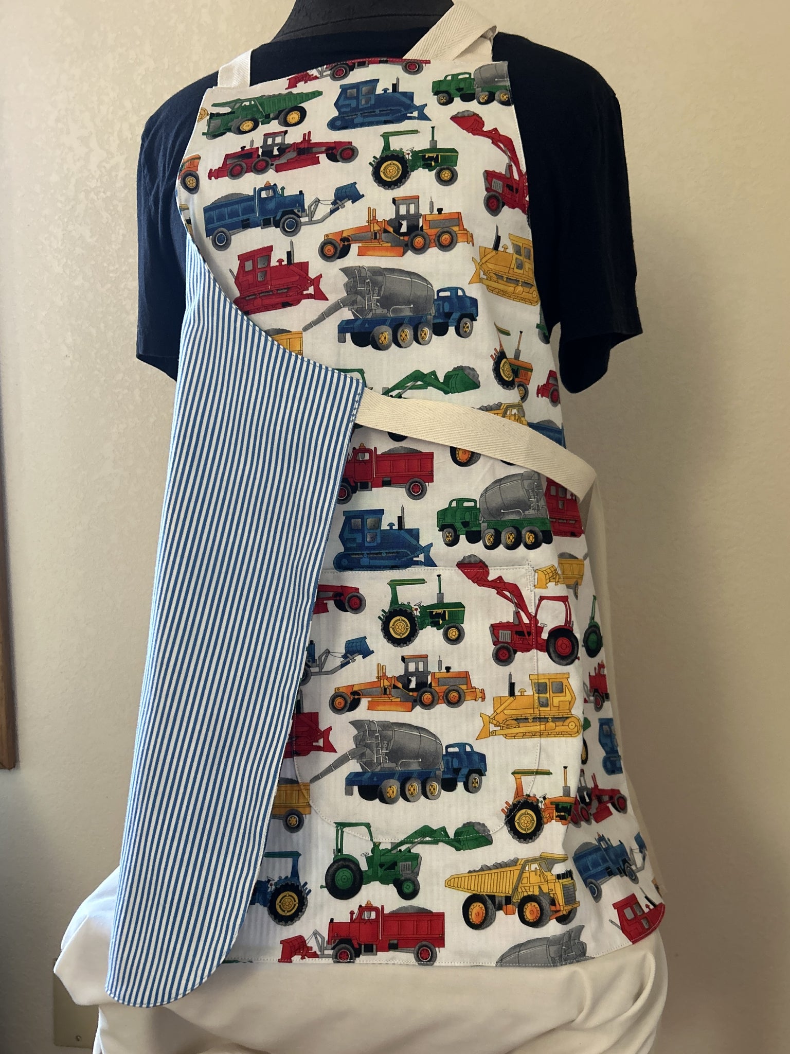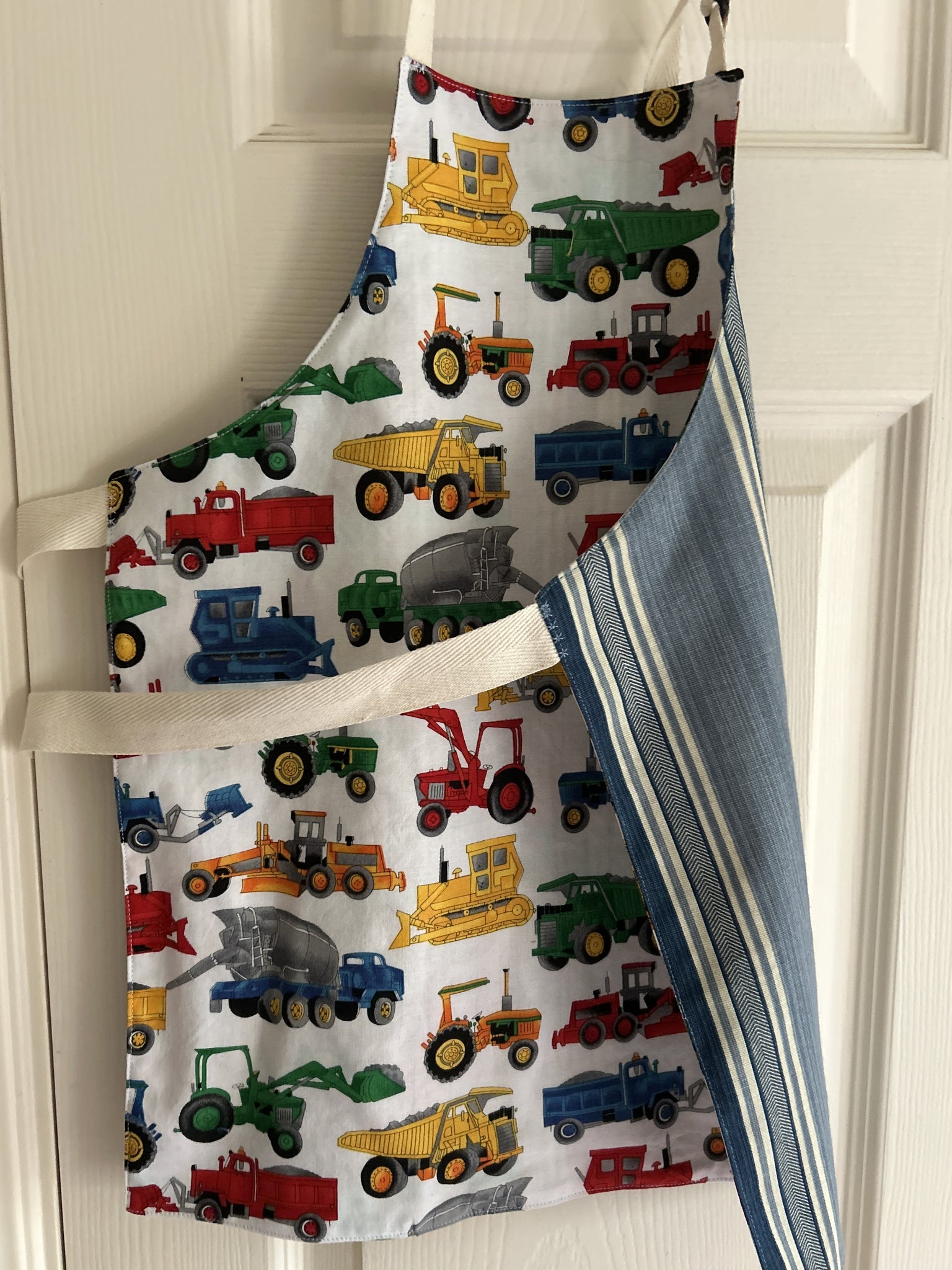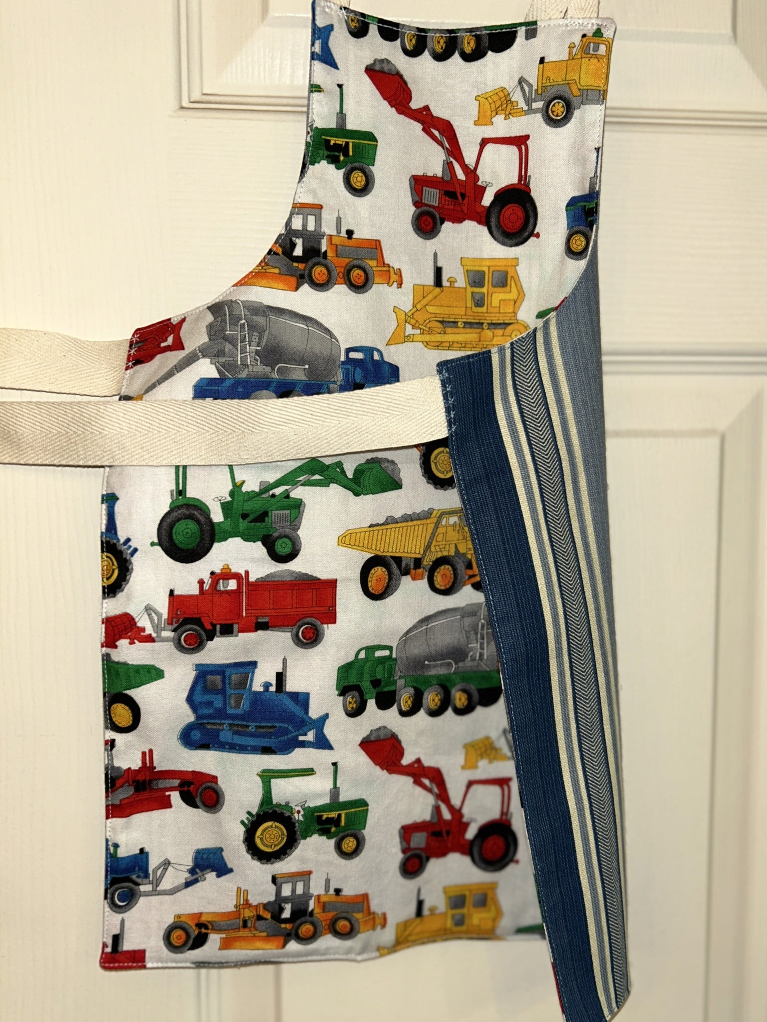 #2B Child apron lined with Colonial Williamsburg Spotswood Stripe, which is bold stripes in shades of denim blue and off-white [0099 & 0100]