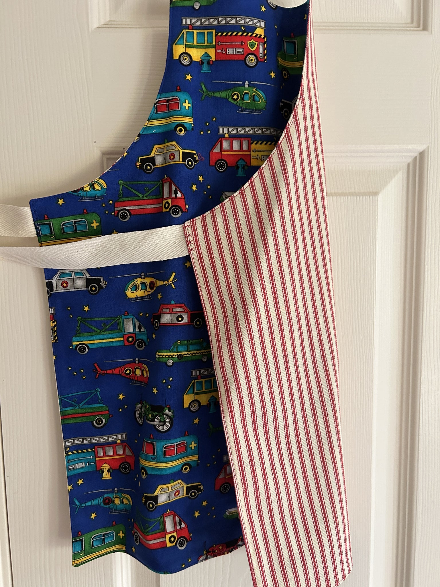 #3B Child apron lined with red and ivory ticking (narrow stripes) [0105 & 0106]