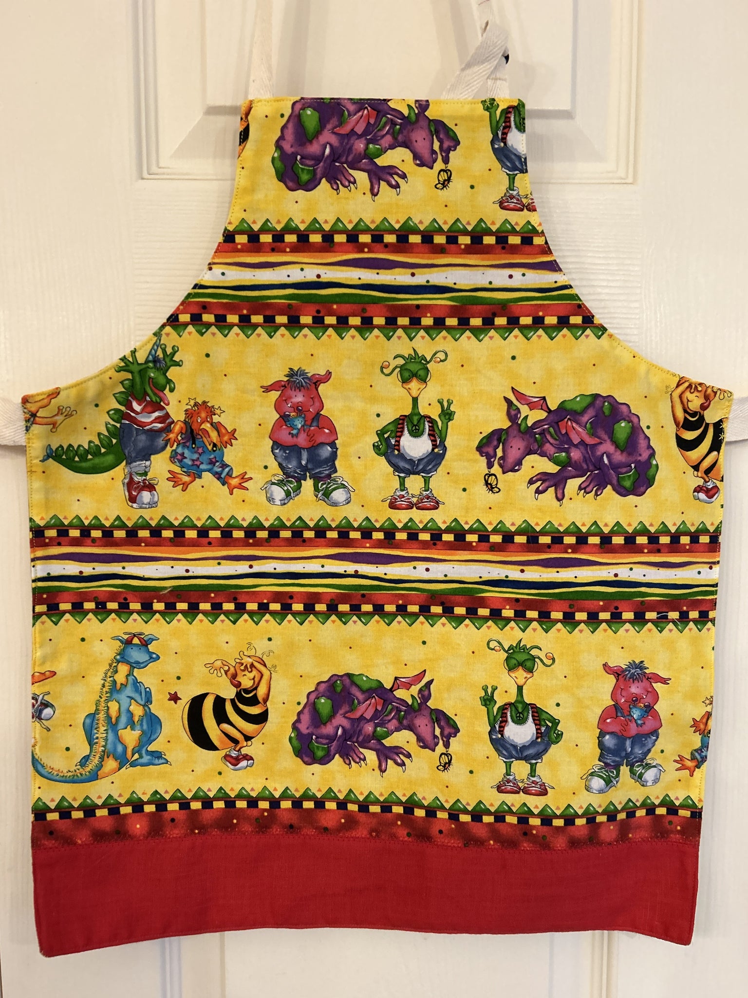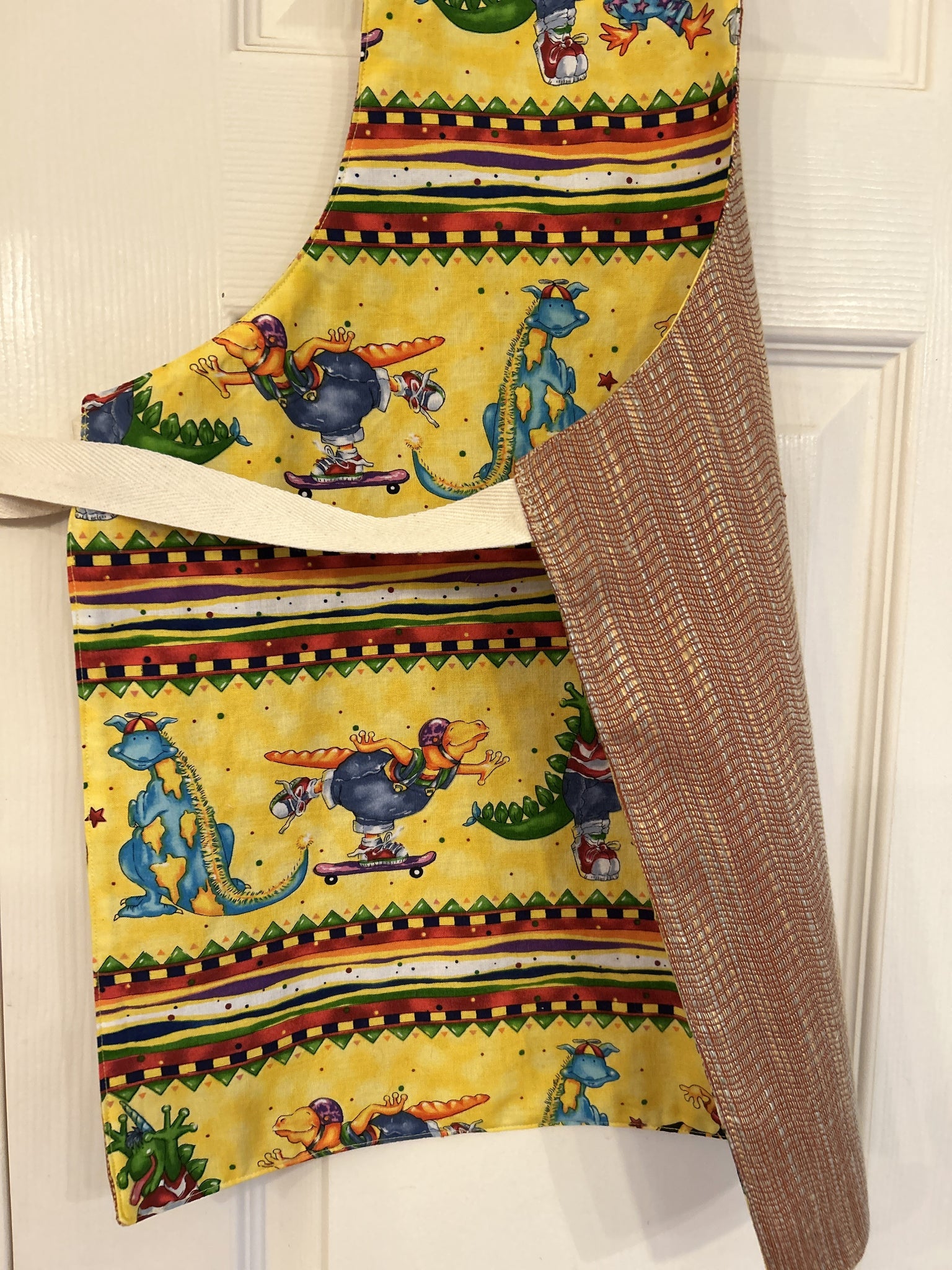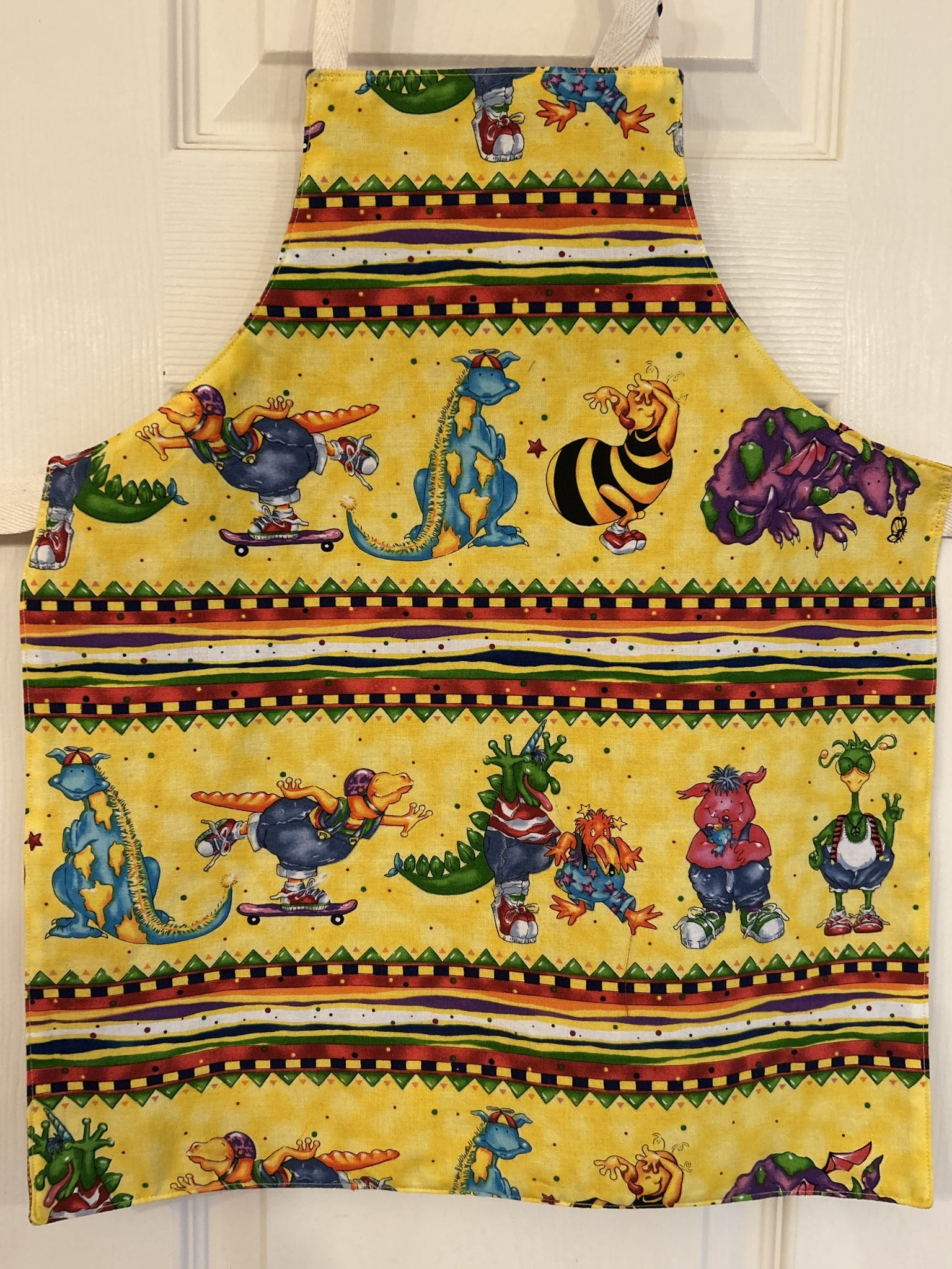 #4 Lil’ Monsters. This print has eight different non-scary monsters (not all monsters are on each apron) in rows (could be cartoonish dinosaurs or similar to the Wuzzles from 1985 cartoon show) separated by horizontal rows of green sawtooth, purple and yellow squares, red, orange, yellow, purple, and white wavy lines, on splotchy yellow background; all are lined with Chatham Sunrise, which is a weave of vertical threads in shades of yellow, gold, orange, and pale grey, with wavy horizontal threads of orange