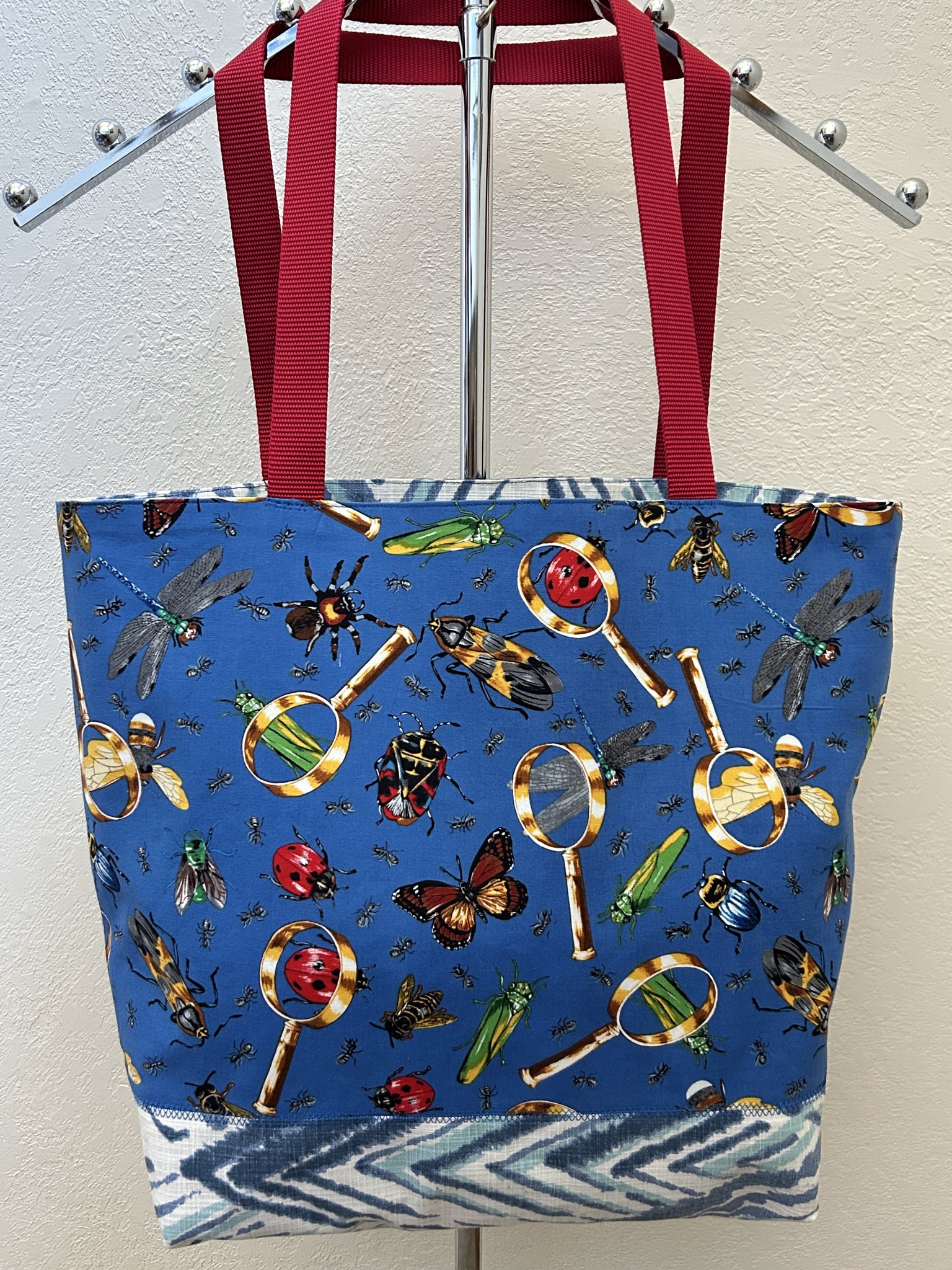 This fabric has many different insects, including lady bugs, bees, wasps, ants, butterflies, dragonflies, beetles, and others I don’t recognize, with some shown through a magnifying glass, on a royal blue background.