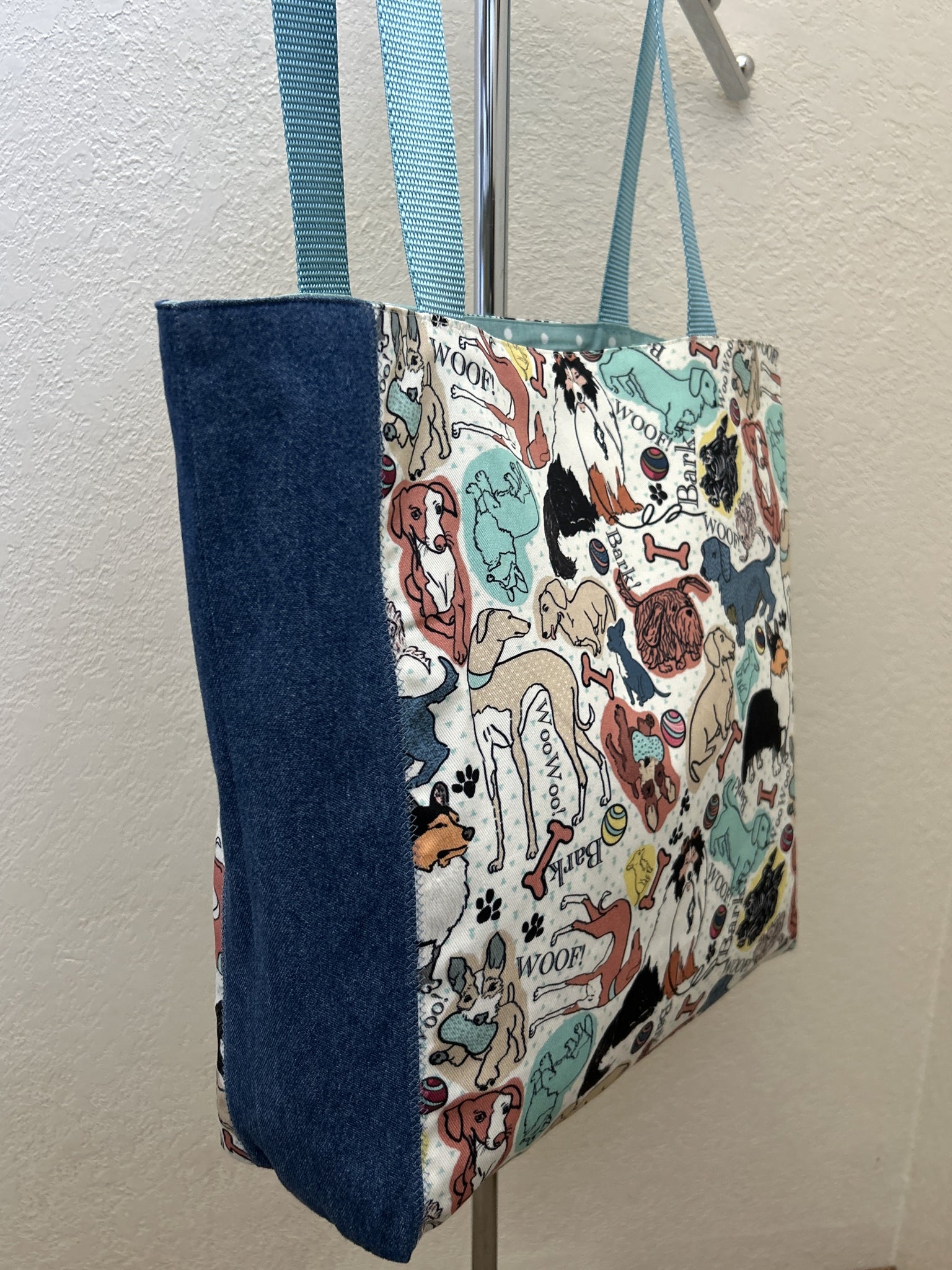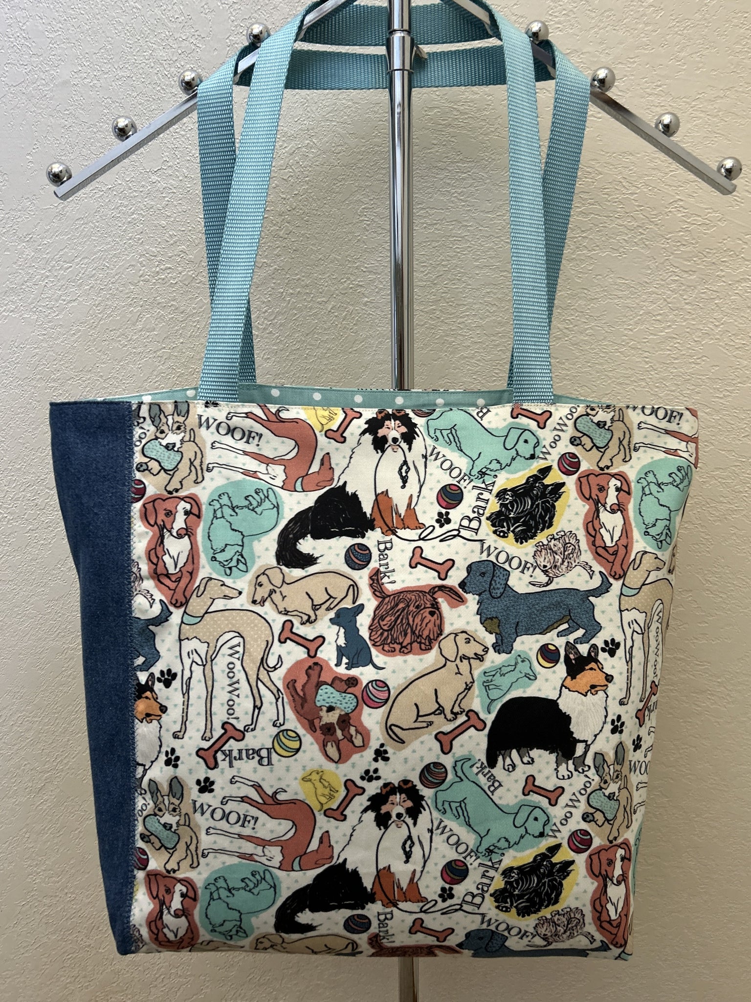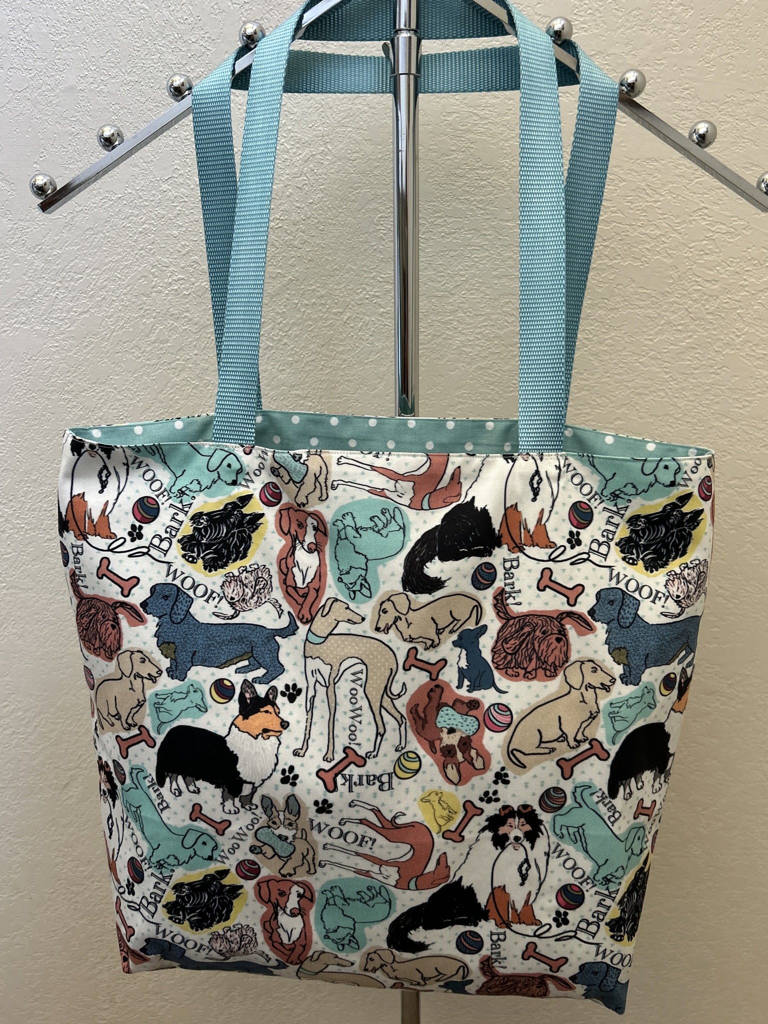 #2 "Woof Woof Bark" Cartoonish Dogs. This custom fabric from Spoonflower has cartoonish dogs in mostly recognizable breeds, with the words Woof, Woof, and Bark scattered throughout; and tiny pale turquoise triangles, dog bones, balls, and paw prints scattered throughout; on a cream-colored background. The breeds include (to the best of my guessing ability) are: Beagle, Chihuahua, Collie, Corgi, Dachshund, Greyhound, Jack Russell Terrier, Miniature Schnauzer or Scottish Terrier, and a few mysteries. Lined with Premier Prints White Dots Canal, a print of small white dots on pale turquoise background that matches the turquoise bubbles that some of the dogs are in; Ocean (Swimming Pool) Blue nylon straps.