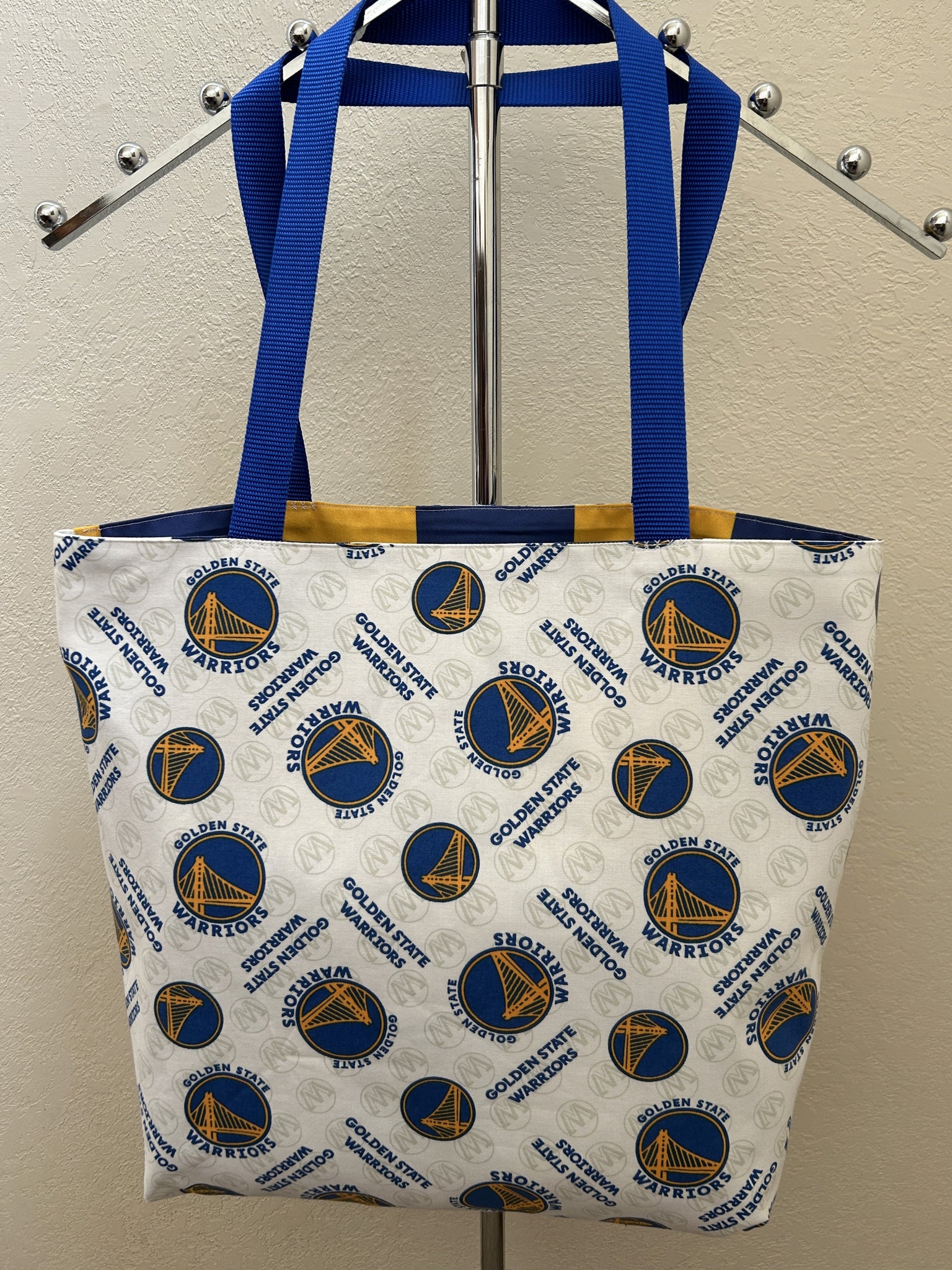 #4 Golden State Warriors NBA Basketball on White. This officially licensed NBA print has the Golden State Warriors’ logo of the Golden Gate Bridge in royal blue circles with GOLDEN STATE and WARRIORS around the circle, smaller royal blue circles with the Golden Gate Bridge; on background of white with small circles containing letter W in pale grey; lined with Spoonflower custom fabric of 3 ¼” checkerboard in Warriors’ colors of royal blue, golden yellow, and white; royal blue nylon straps (9948 & 9949)