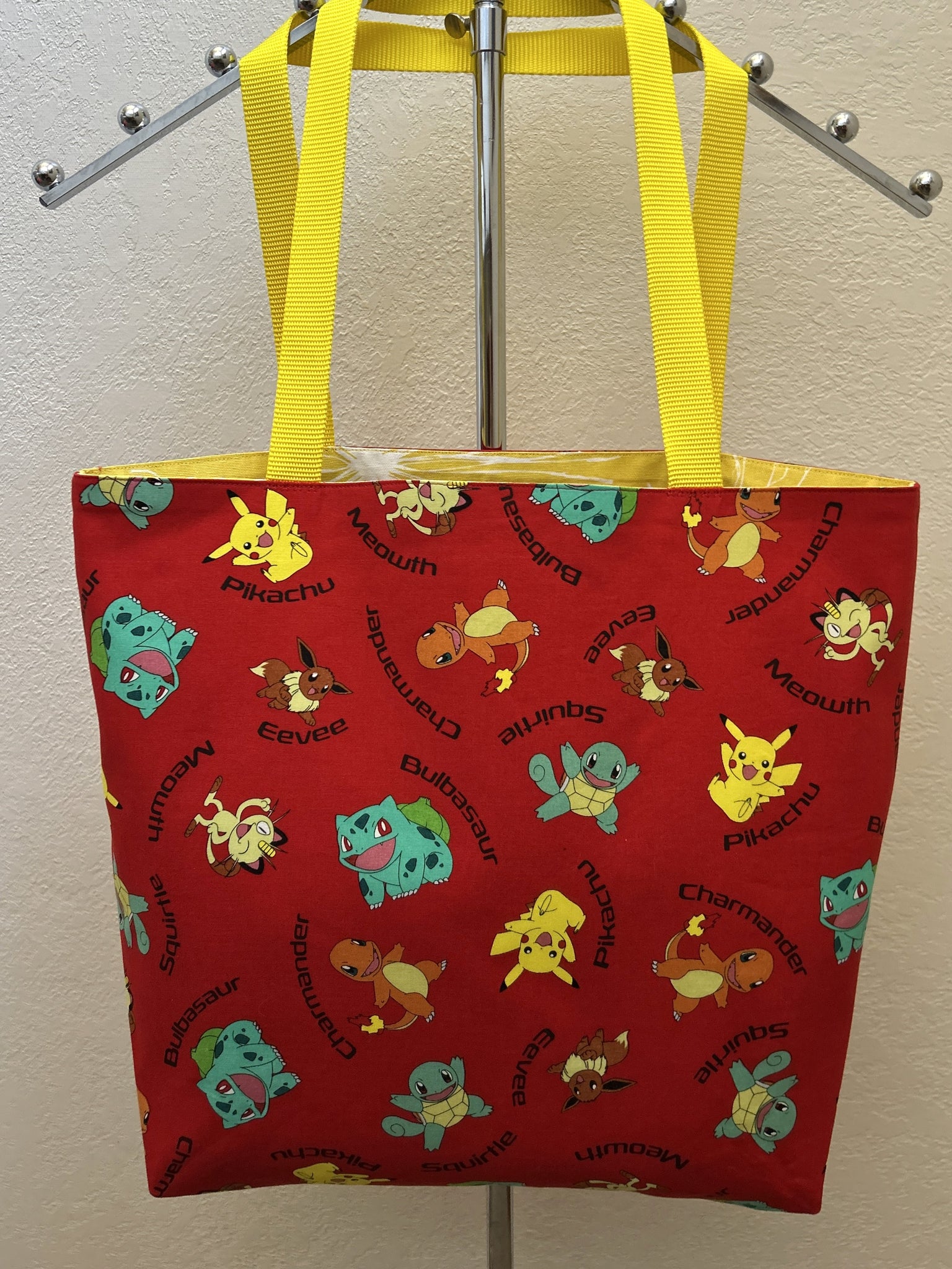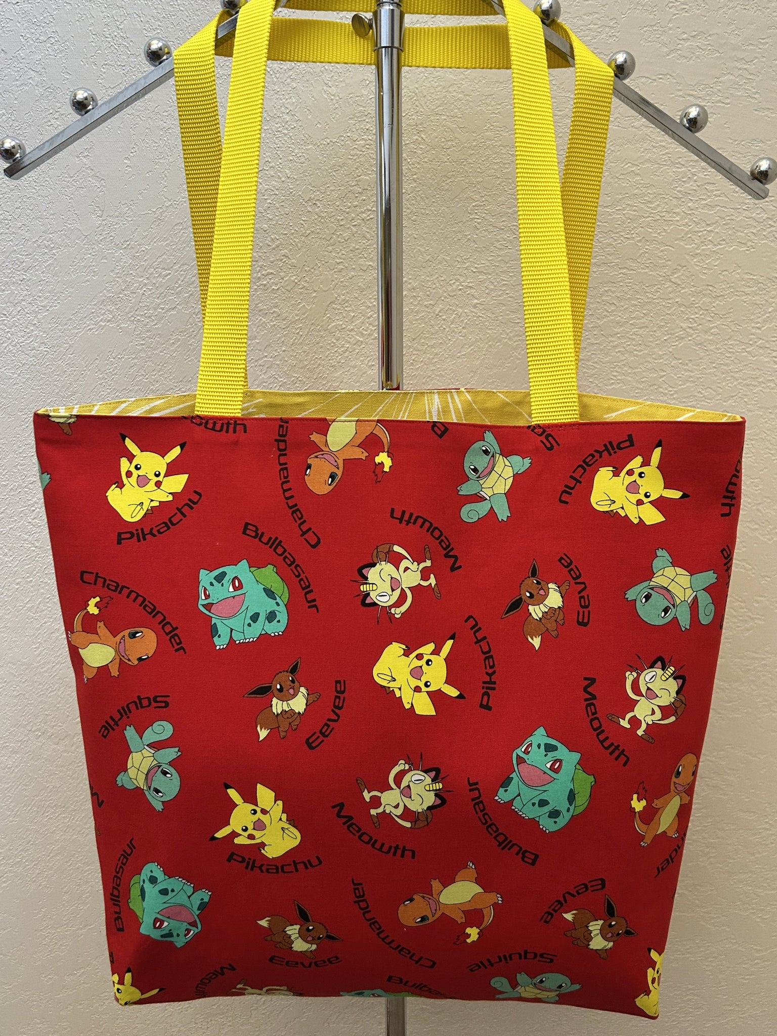 #1 Pokemon Name Toss. Pokemon characters Bulbasaur, Chamander, Eevee, Meowth, Pikachu, and Squirtle, tossed on bright red background; lined with Sparks Mimosa, which is a white fireworks brocade pattern on lemon yellow background; yellow nylon straps. [two identical tote bags] [0157 SOLD] [0158] #2 What would you like?